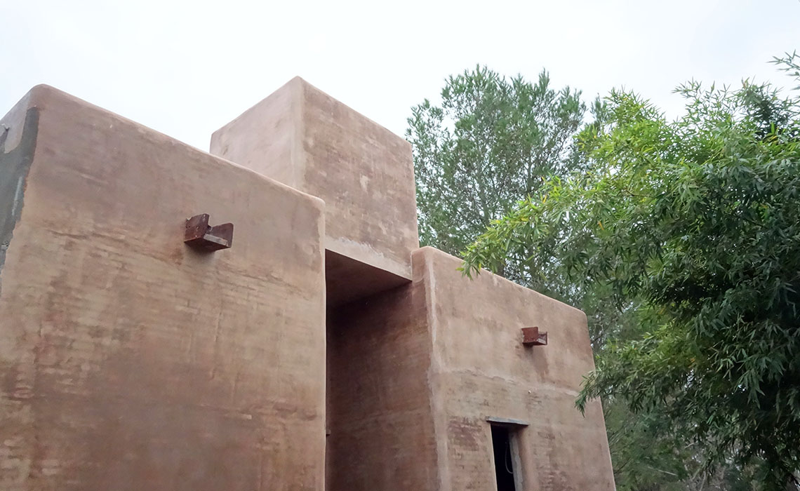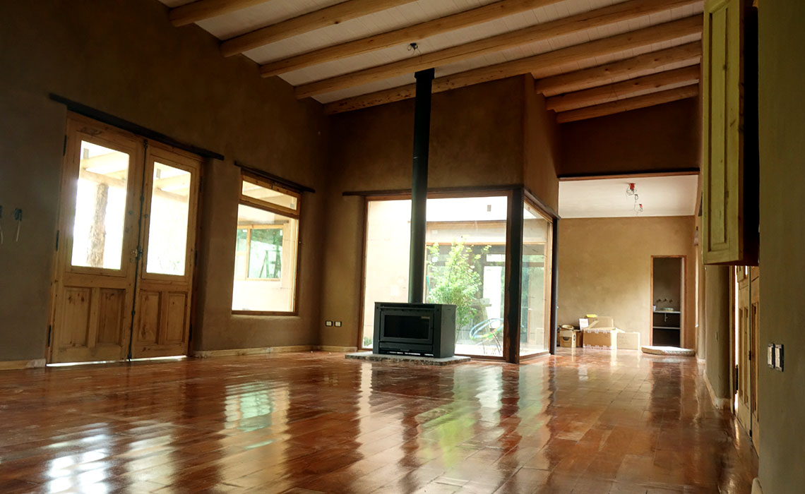 Los muros perimetrales se proyectaron y se ejecutaron en BTC (Bloques de Tierra Compactada). Consiste en un muro doble de bloques de BTC “anclados y encastrados” mediante morfología “Rasty”, con sus respectivos revoques de mortero de barro.