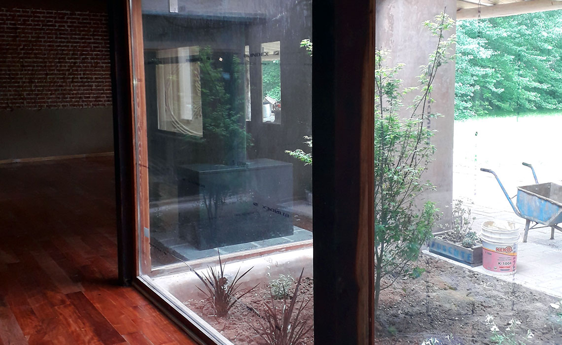 La casa está elevada 80cm del nivel de terreno natural, por necesidades hidráulicas y geográficas. Se define el nivel de piso interior, con una losa de viguetas suspendida con simples apoyos, generando de ésta manera lo que nosotros consideramos “cámara de aire de distribución”, mejorando considerablemente la vida útil de todos los componentes edilicios (mamposterías, revoques, losas, pisos, etc).